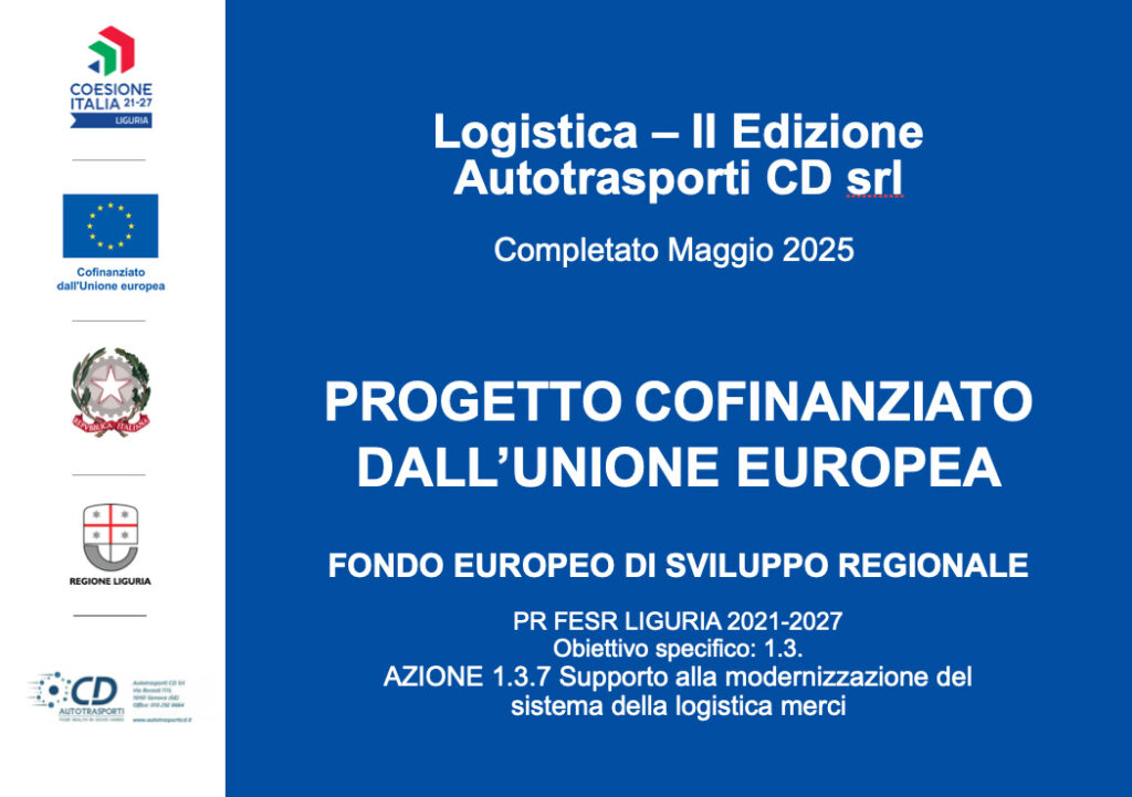 May 2025 – Completion of the project co-financed by the Liguria Region with resources from the PR FESR LIGURIA 2021–2027, Action 1.3.7 Support for the modernization of the freight logistics system for Ligurian SMEs.