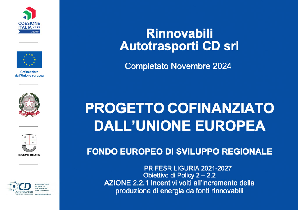 November 2024 – Final disbursement of the contribution for the project co-financed by the Liguria Region with resources from the PR FESR LIGURIA 2021–2027, Action 2.2.1 – Incentives aimed at increasing energy production from renewable sources for Ligurian SMEs.